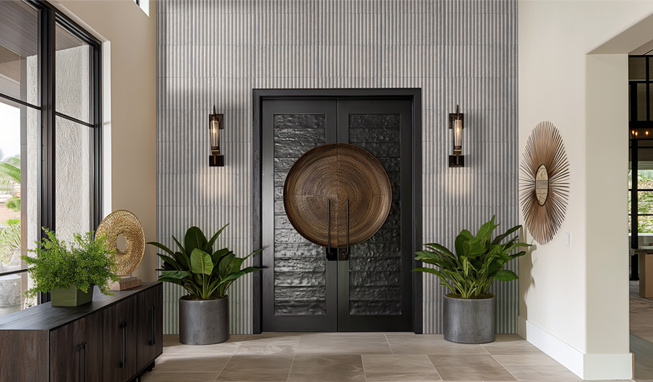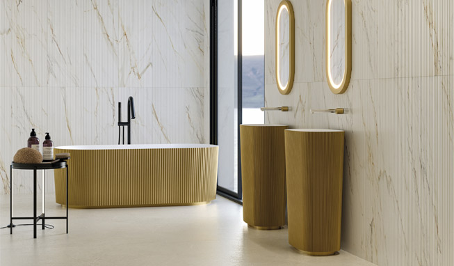 Classic Italian marble meets fluted architectural slats, creating a dynamic allure to feature walls in foyers, kitchens, bathrooms, and beyond.