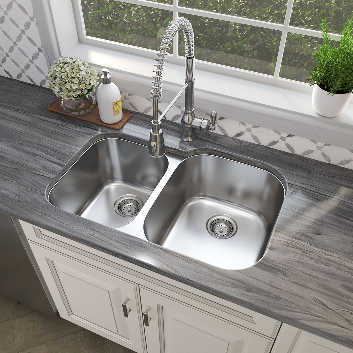 This modern double bowl undermount sink with rounded corners is constructed with 18-gauge stainless steel for reliable durability. With one smaller and one larger basin (40/60), this sink accommodates your large cookware such as stockpots and baking sheets while keeping everyday glasses and dishes separate and safe. An ideal choice for busy homes and light […]