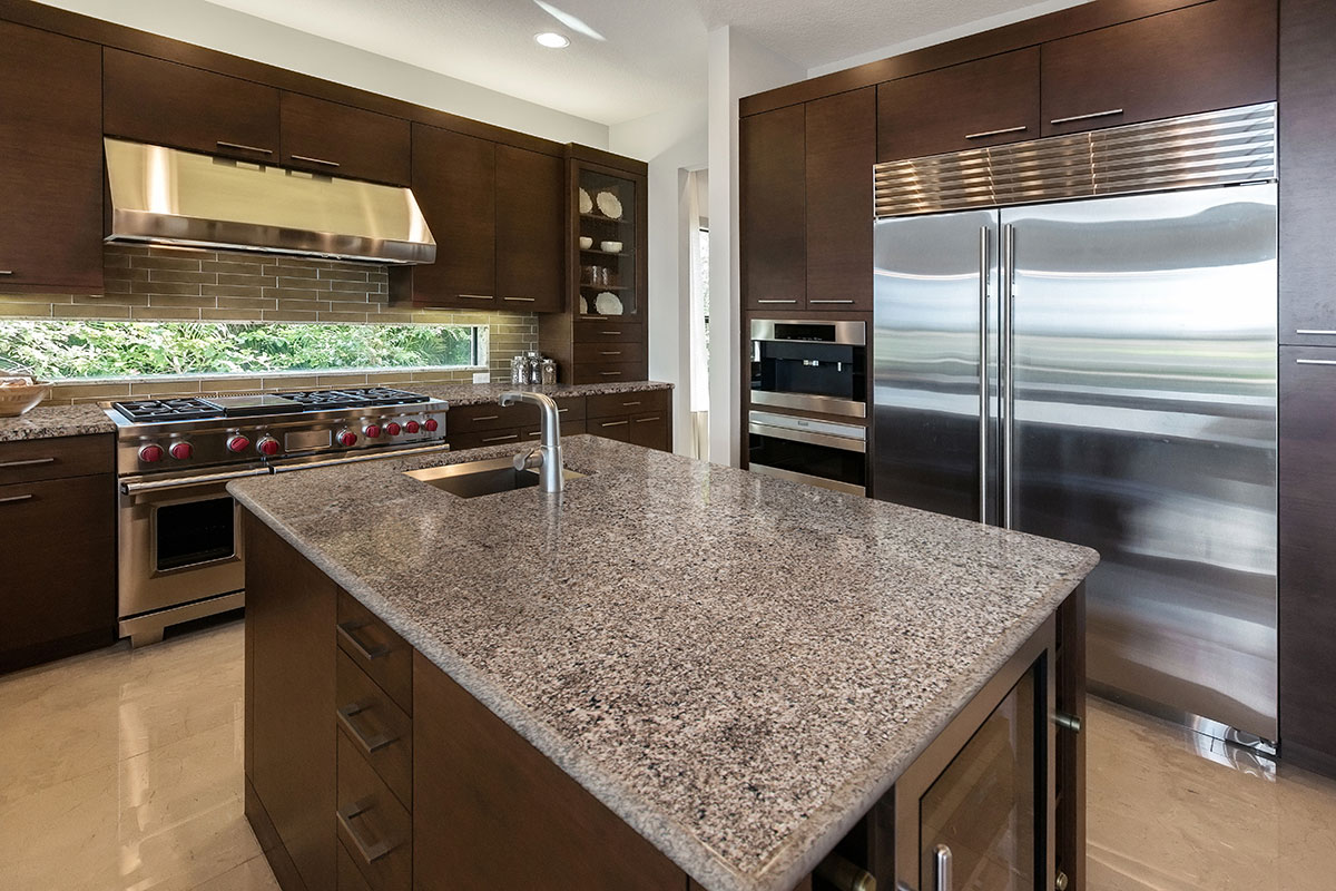 Arctic Sand granite countertops from India offer visual appeal and lovely movement by mixing together warm whites with soft beige, taupe, and black colorways. The polished surfaces create smooth finishes and sophisticated sheen and will look fabulous with a variety of kitchen and bathroom designs that feature various wood tones.