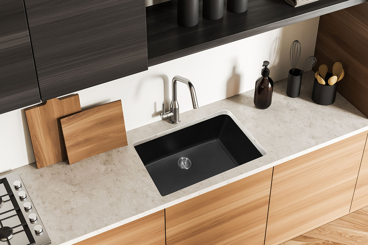 This beautiful black quartz single bowl undermount sink is scratch, stain, and germ resistant. With one generous 9β deep basin, it easily accommodates your large cookware and stacks of dishes. An ideal choice for busy homes and light commercial environments, this quartz sink is designed to be heat resistant up to 535 degrees Fahrenheit and […]