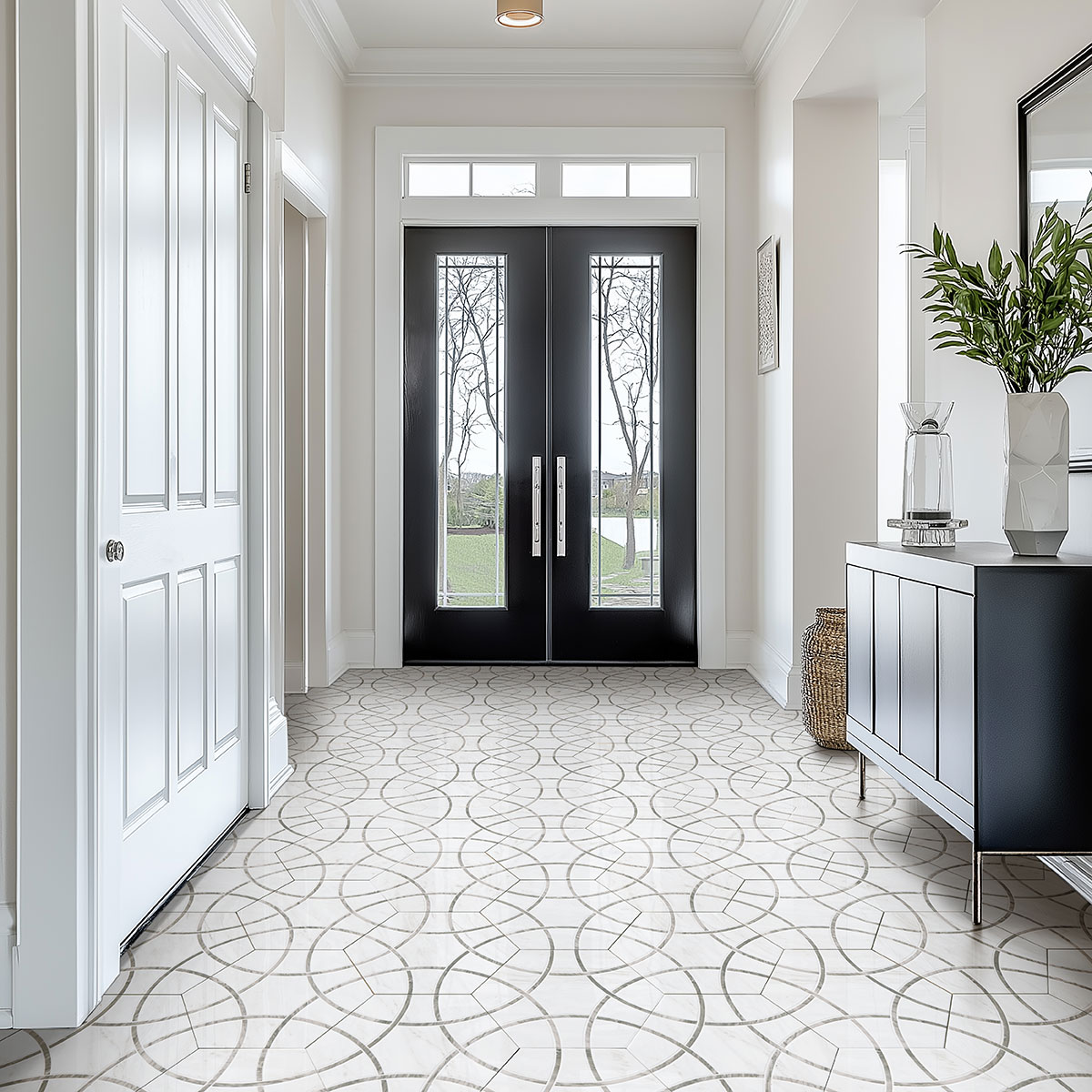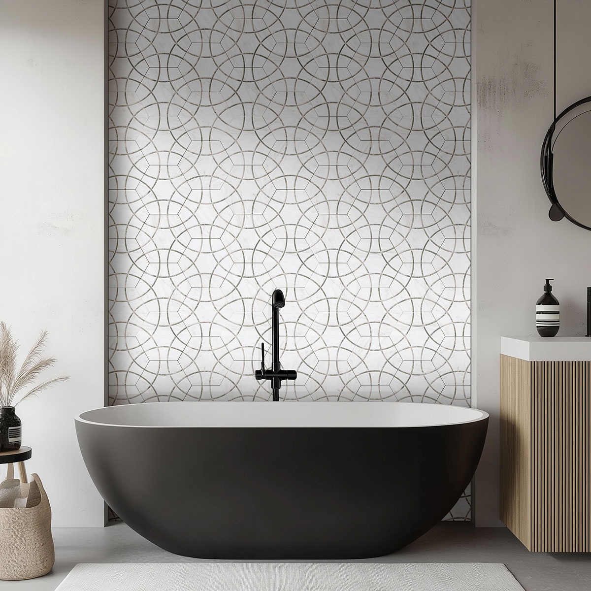 Cloud from the GeoGlam Collection turns ordinary surfaces into works of art. These 11” x 13” hexagonal tiles rest on a Calacatta marble-look base, where a whisper-soft gray circular pattern weaves a mesmerizing, interconnected design. Offering the sophistication of a waterjet mosaic with the easy maintenance of porcelain, this matte-finish tile is perfect for floors, […]