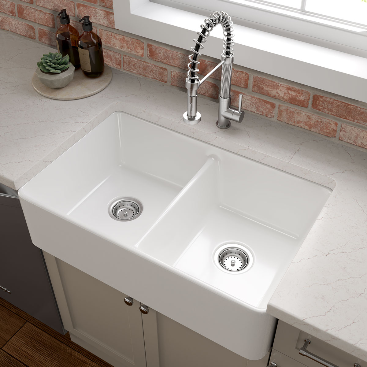 This gorgeous white fireclay double basin undermount sink features an apron for a finished look that completes your kitchen. The perfect touch to coastal, farmhouse, or almost any design aesthetic, this fireclay sink offers clean lines and a fresh look that will stay that way for years to come. For convenience, it has two equally […]