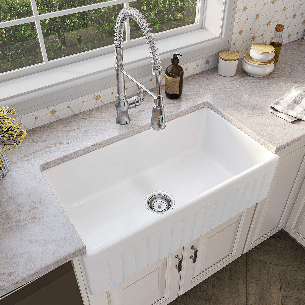 The Fireclay Farmhouse White Single Bowl sink presents a refined addition to your kitchen, combining elegance with functionality. Its versatile design allows you to install it with either the fluted or plain face showing, tailoring the look to your preference. Measuring 33” x 18” overall, with a bowl size of 31.25” x 16.25”, this sink […]